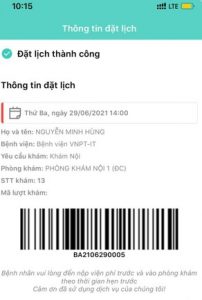 | – Người dùng xem chi tiết thông báo và dùng mã đặt chỗ (Qrcode) để đến checkin tại CSYT | ![]() |